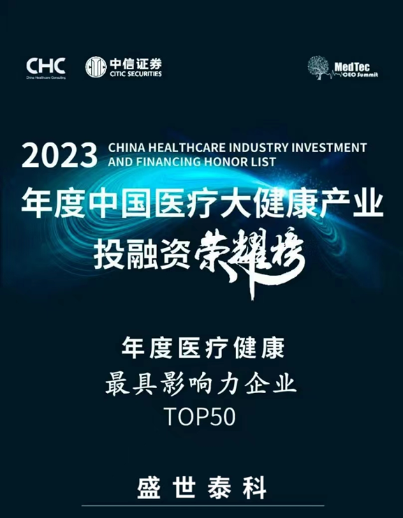 Recently, CHC Medical Consulting, in collaboration with CITIC Securities, officially unveiled the "2023 China Healthcare and Greater Health Industry Investment & Financing Honor List." As an innovative pharmaceutical company already in the commercialization phase, Shengshi Taikang once again Ranked on the list of this category, Obtain 2023 China's Top 50 Most Influential Healthcare Companies Award 。